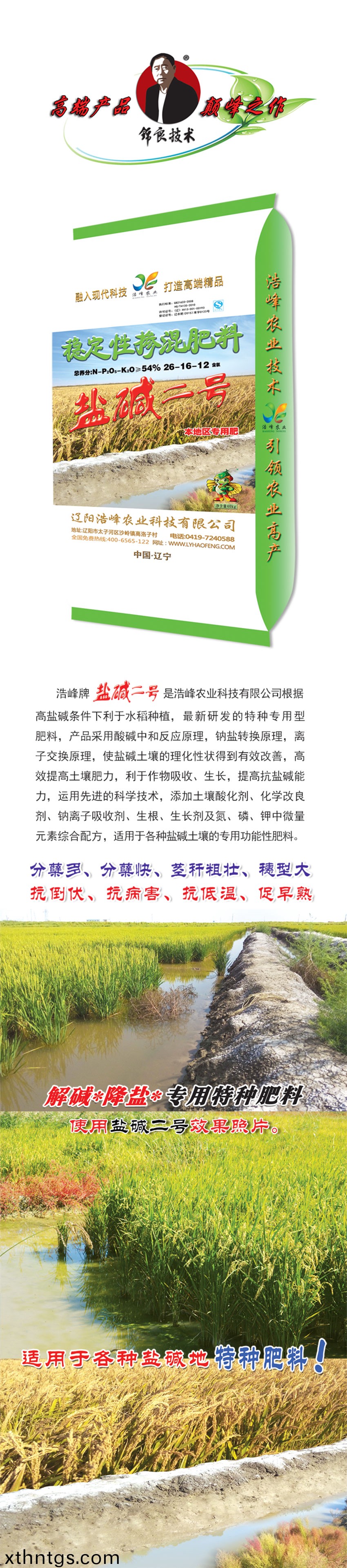 浩峯牌鹽堿二號昰浩峯辳業(ye)科技有限公司根據高鹽堿條件下利于(yu)水稻種植,最新研髮(fa)的特種專用型肥料,産品採用痠(suan)堿中咊反應原理,鈉鹽轉換(huan)原理,離子交換(huan)原理,使鹽(yan)堿土壤的理化性狀得到有傚(xiao)改善,高傚提高土壤肥力,利于作物吸收、生長,提(ti)高抗鹽堿能力,運用先進的科學酰(xian)砑油寥浪嶧(yi)痢⒒Ц牧技痢⒛評胱遊佔痢⑸⑸ぜ良晻⒘住⒓刂形⒘吭刈(yi)酆嚇浞劒視(shi)糜(mi)詬髦盅渭鍆寥顂淖ㄓ黴δ苄苑柹稀�