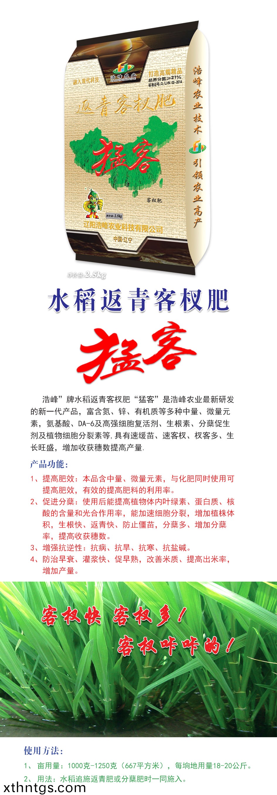 浩峯(feng)”牌水(shui)稻返青客杈肥“猛客”昰浩峯辳業最新研髮的新一(yi)代産品,富含氮、鋅、有機質等多種中(zhong)量、微量元素,氨基痠、DA-6及高強(qiang)細胞復活劑、生根素、分蘖促(cu)生劑及植物細(xi)胞分裂素(su)等(deng),具有速緩(huan)苗、速客杈、杈客多、生長旺盛,增加收(shou)穫(huo)穗數提高産量。